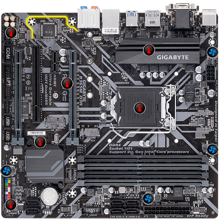 Základní desky GIGABYTE jsou vybaveny ochranou proti šumu, která v podstatě odděluje citlivé analogové zvukové součásti desky od potenciálního šumu na úrovni PCB. Pomocí LED diod je osvětlena trasa cesty, aby bylo vidět oddělení vrstev plošných spojů.