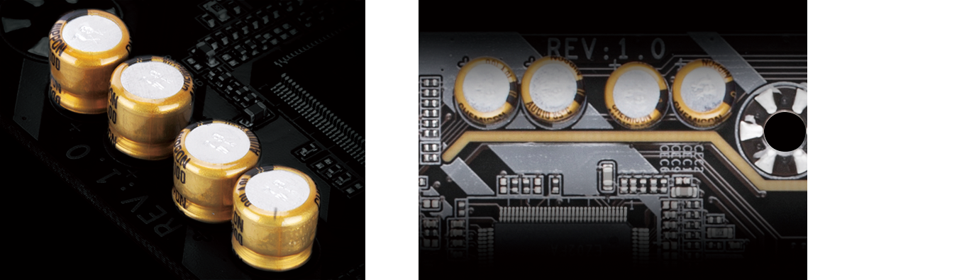 Základní desky GIGABYTE používají špičkové audiokondenzátory Nichicon. Tyto vysoce kvalitní kondenzátory přináší nejkvalitnější zvuk s nejjemnějším rozlišením a nejrealističtější zvukové efekty pro hráče.