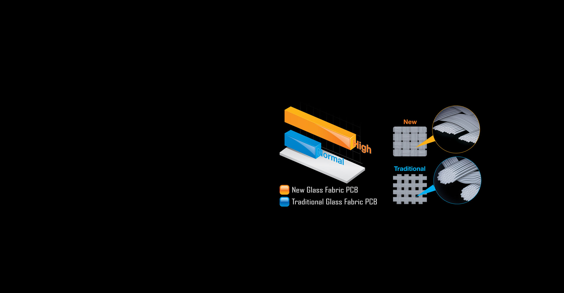 Nic nemá tak velký negativní vliv na životnost vašeho počítače jako vlhkost. Většina částí světa přitom trpí vysokou vlhkostí vzduchu po celý rok. Základní desky GIGABYTE 9 byly navrženy tak, aby bylo jisté, že nebude vlhkost vzduchu představovat již žádný problém. Mohou se pochlubit novou technologií výroby PCB ze skelné tkaniny, která odpuzuje vlhkost vyskytující se vlhkém prostředí Nová technologie PCB ze skelné tkaniny využívá k výrobě PCB nový materiál, který snižuje velikost mezery mezi vlákny, takže je pro vlhkost mnohem obtížnější proniknout skrz v porovnání s tradičně řešenými PCB. To přináší mnohem lepší ochranu před zkratem a selháním systému způsobeným vlhkostí v okolním prostředí.