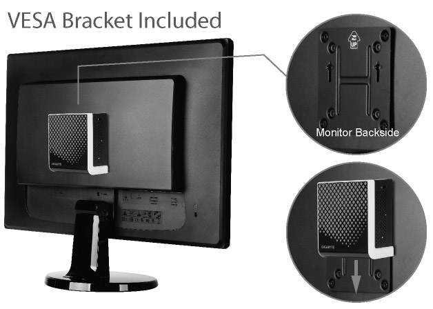 Díky přiloženému VESA držáku lze BRIX snadno namontovat na zadní stranu monitoru nebo HD televizoru. BRIX tak nabízí jednoduchý a efektivní způsob, jak proměnit jakýkoli displej či televizor s podporou standardu VESA na plnohodnotný počítač.