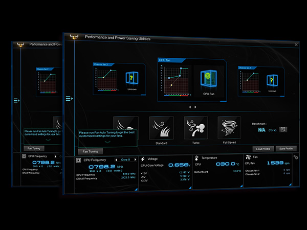 Systémové teploty jsou klíčem ke stabilnímu hernímu zařízení – zvláště teploty GPU. Herní základní desky TUF Gaming jsou vybavené softwarovým nástrojem Fan Xpert 2+, který inteligentně ovládá systémové ventilátory na základě vstupu z více senzorů, včetně teploty grafické karty ASUS*. Tím zajistíte, že váš systém založený na TUF Gaming zůstane perfektně chlazený, bez ohledu na to, jak dlouho budete hrát.