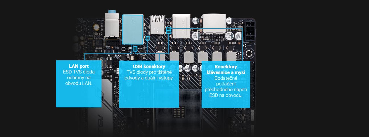 Ochranné prvky ASUS ESD Guards jsou schopny odolat +/- 10 kV v případě vzduchového výboje a +/- 6 kV v případě kontaktního výboje. Využíváme aktivní ochranné obvody, které chrání váš systém před elektrostatickým rušením a poškozením, čímž zaručují delší životnost komponent.