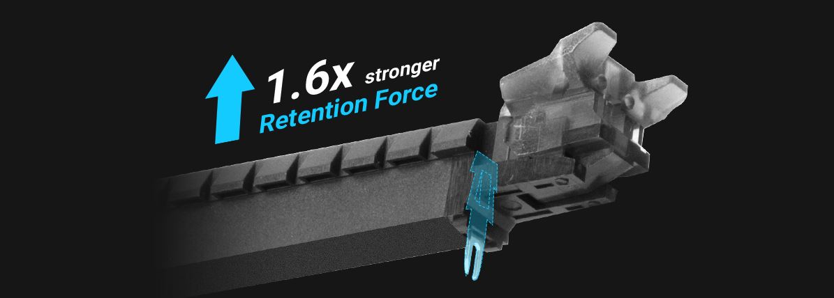 Stačí pouze lehce stlačit velkou lamelu Q-Slotu, a grafická karta vyskočí sama! Instalace nebo demontáž grafických karet se tak obejde bez jakékoliv námahy!