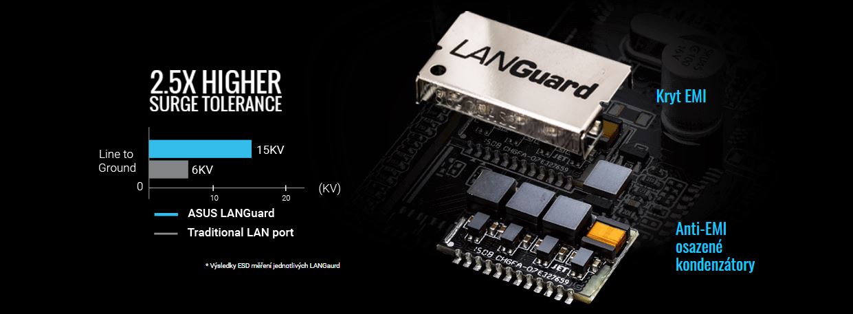 ASUS LANGuard přináší ochranu síťových komponent na hardwarové úrovni, která využívá technologii párování signálů a špičkové kondenzátory určené pro povrchovou montáž, jež jsou odolné proti elektromagnetickému rušení. Výsledkem je spolehlivější připojení a vyšší propustnost. K dispozici jsou rovněž komponenty s elektrostatickou a přepěťovou ochranou nabízející větší odolnost vůči statické elektřině a lepší ochranu před napěťovými špičkami.