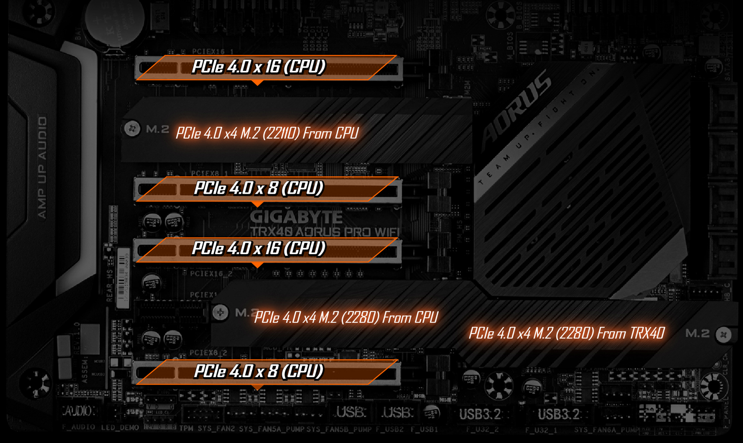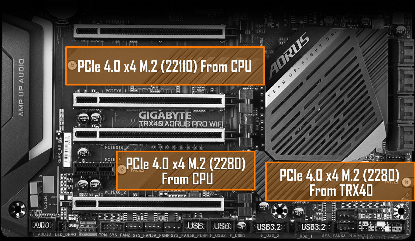 TRX40 AORUS PRO WIFI je vybavena několika novými komponenty, které zajišťují nejlepší kvalitu signálu PCIe 4.0, včetně PCB, slotů PCIe, konektorů M.2, re-driverů, přepínačů, které jsou speciálně navrženy pro PCIe 4.0. Výkon PCIe 4.0 nebude ohrožen.