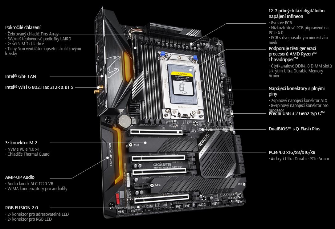 Základní desky GIGABYTE jsou pověstné svou trvanlivostí a vysokou kvalitou výrobního procesu. Netřeba dodávat, že u TRX40 AORUS PRO WIFI používáme ty nejlepší komponenty, které najdeme a vyztužujeme každý slot, aby byly všechny pevné a odolné.