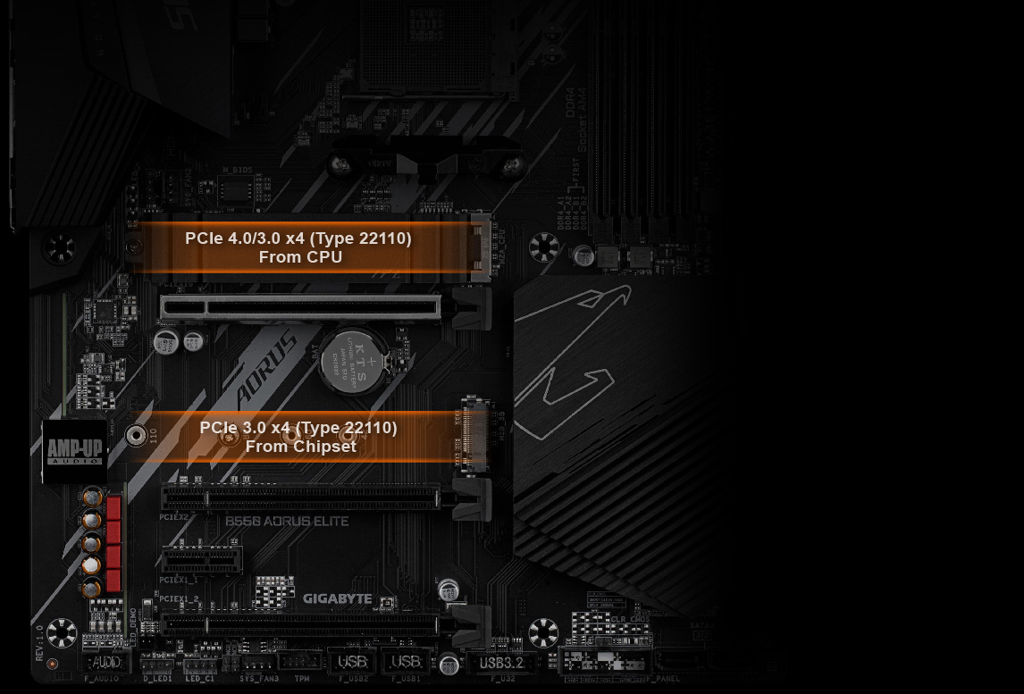 Uživatelům, kteří požadují vysokou kapacitu a hledají nejvyšší výkon, nabízejí základní desky B550 AORUS v oblasti zařízení pro NVMe nejlepší kompatibilitu v odvětví. Unikátní řešení AORUS lze nakonfigurovat do pole RAID a dosáhnout tím rekordního zrychlení až na 6560 MB/s při sekvenčním čtení, díky čemuž je AORUS jasnou volbou pro dokonalý počítač.
