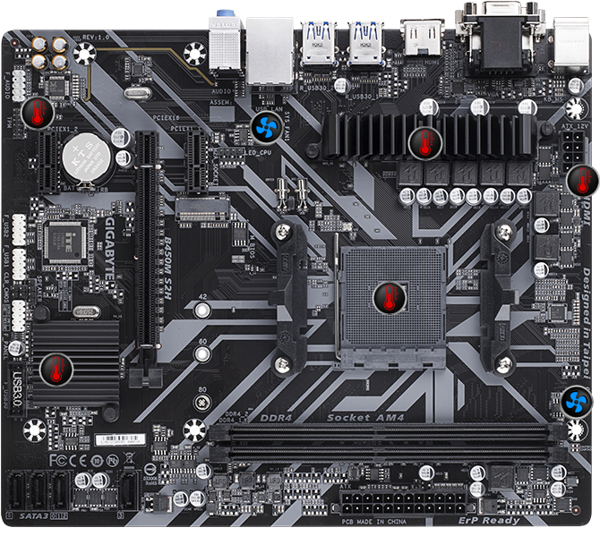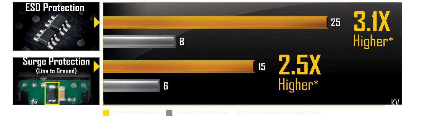 Základní desky GIGABYTE používají integrované obvody s až třikrát vyššími úrovněmi ochrany vůči ESD v porovnání s tradičními integrovanými obvody. To pomáhá lépe chránit základní desku a její součásti před potenciálními poškozením způsobenými statickou elektřinou. Základní desky GIGABYTE jsou vybaveny speciálními integrovanými obvody přepěťové ochrany, které chrání základní desku a váš počítač před jakýmkoli nárůstem energie, jaké mohou nastat. To pomáhá zajistit, že se počítač vypořádá s případnými nepravidelnými a nekonzistentními přísuny energie.