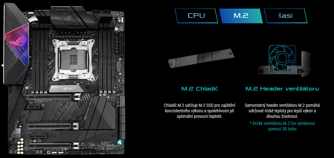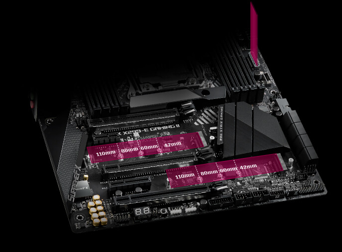 ROG Strix X299-E Gaming II disponuje třemi sloty M.2. Jeden slot podporuje režimy SATA i PCIe 3.0 x4 a ostatní sloty podporují PCIe 3.0 x4 pro NVMe. Společně vám poskytují nejrychlejší a nejflexibilnější dostupné rozhraní M.2.