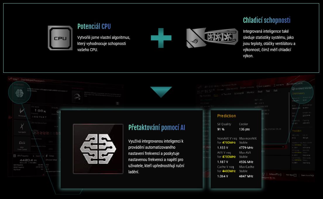 Přetaktovací technologie ASUS AI Overclocking umožňuje automatické ladění rychleji a inteligentněji než kdykoli dříve. Je k dispozici ve Windows nebo přímo prostřednictvím UEFI, nastavuje profily CPU i chladiče a předpovídá optimální konfiguraci pro každý jednotlivý systém.