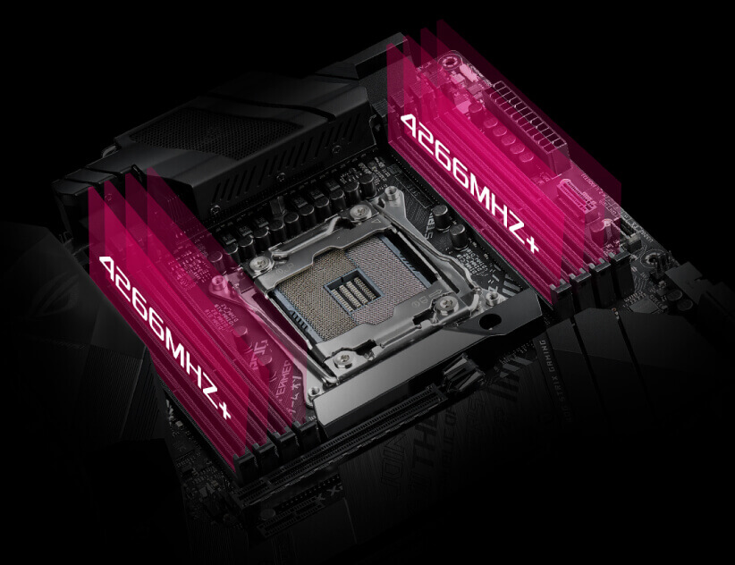 Platforma X299 poskytuje dostatečnou kapacitu na více frontách. Její driver čtyřkanálové paměti podporuje v osmi slotech až 256 GB paměti DDR4. Díky optimalizovanému rozvržení tras může ROG Strix X299-E Gaming II dosáhnout DDR4 4266 MHz rychlost paměti nebo vyšší.