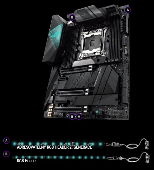 Adresovatelné headery 2. generace na ROG Strix X299-E Gaming II jsou nyní schopné detekovat počet LED na adresovatelných RGB zařízeních druhé generace, což umožňuje softwaru automaticky přizpůsobit světelné efekty konkrétním zařízením. Nové headery také nabízí zpětnou kompatibilitu s existujícím zařízením Aura RGB.