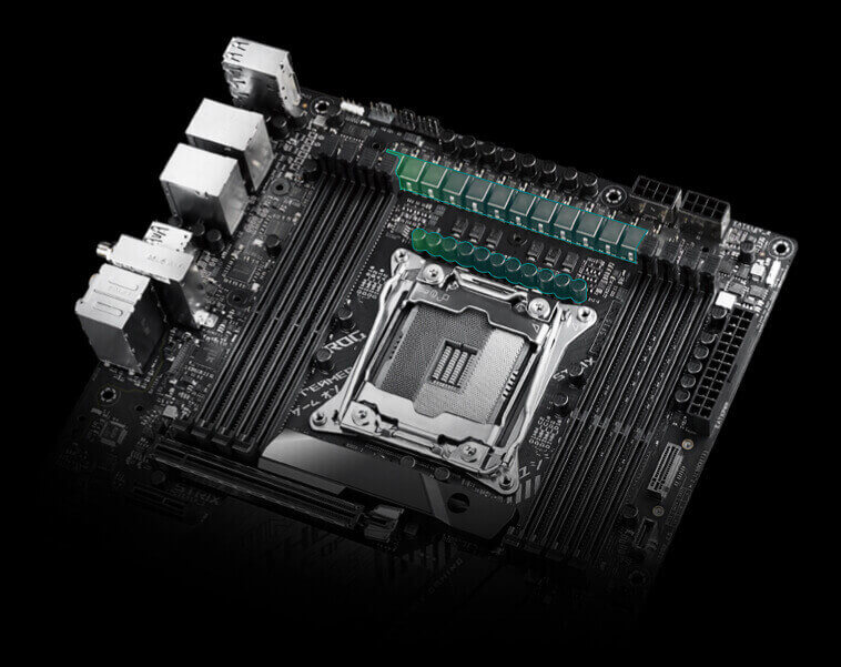 ROG Strix X299-E Gaming II má CPU VRM s 12 výkonovými stupni, které kombinují MOSFET a ovladače na vysoké a nízké straně do jediného balíčku, čímž dodávají energii a efektivitu vyžadované nejnovějšími procesory Intel.