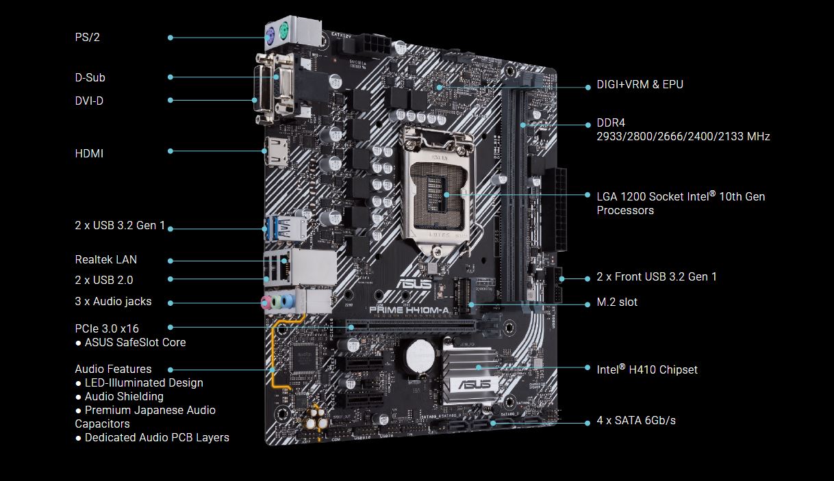 Řada ASUS Prime je odborně navržena tak, aby uvolnila plný potenciál procesorů Intel® Core™ 10. generace. Základní desky řady H410 se vyznačují robustním designem napájení, komplexním řešením chlazení a inteligentními možnostmi ladění a poskytují každodenním uživatelům a všem stavitelům vlastního PC, kteří hledají dobře vyvážené specifikace a řadu možností pro vyladění výkonu pomocí intuitivního softwaru a firmwaru.