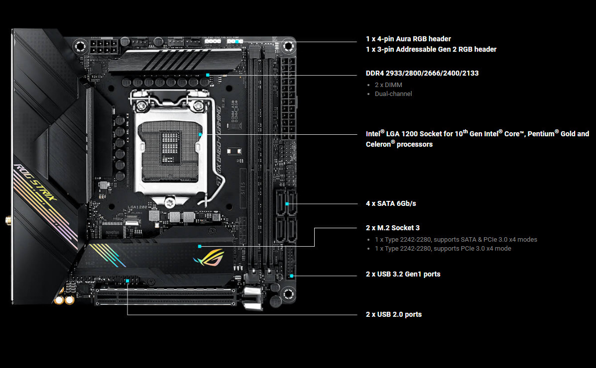 Herní základní deska ROG Strix B460-I nabízí solidní dodávku energie a efektivní chlazení navržené pro nejnovější procesory Intel® Core™ 10. generace. Díky poutavému futuristickému estetickému a intuitivnímu softwaru ROG vám ROG Strix B460-I Gaming poskytne základ pro vaší vysněnou herní sestavu.