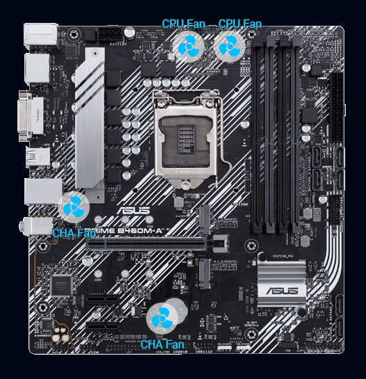 Řada Prime B460 obsahuje komplexní ovládací prvky chlazení, které lze konfigurovat pomocí softwaru Fan Xpert 2+ nebo prostřednictvím systému UEFI BIOS.