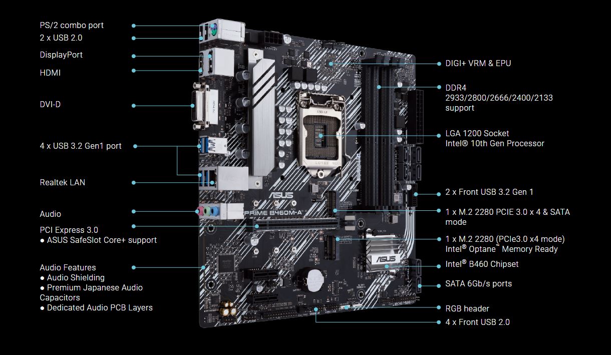 Řada ASUS Prime je odborně navržena tak, aby uvolnila plný potenciál procesorů Intel® Core™ 10. generace. Základní desky řady B460 se vyznačují robustním designem napájení, komplexním řešením chlazení a inteligentními možnostmi ladění a poskytují každodenním uživatelům a všem stavitelům vlastního PC, kteří hledají dobře vyvážené specifikace a řadu možností pro vyladění výkonu pomocí intuitivního softwaru a firmwaru.
