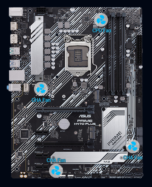 Řada Prime H470 obsahuje komplexní ovládací prvky chlazení, které lze konfigurovat pomocí softwaru Fan Xpert 2+ nebo prostřednictvím systému UEFI BIOS.