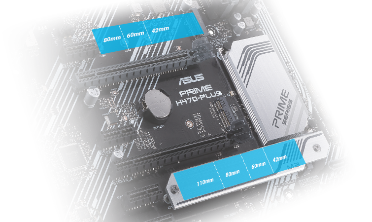 Prime H470-PLUS podporuje ThunderboltEX 3-TR, přídavnou kartu Thunderbolt™ 3 s certifikací Intel, která umožňuje obousměrné rychlosti až 40 Gbps pomocí jediného kabelu. Integrovaný header Thunderbolt 3 může navíc podporovat až šest zařízení v sériovém zapojení a poskytovat až 100 wattů energie pro rychlé nabíjení zařízení.