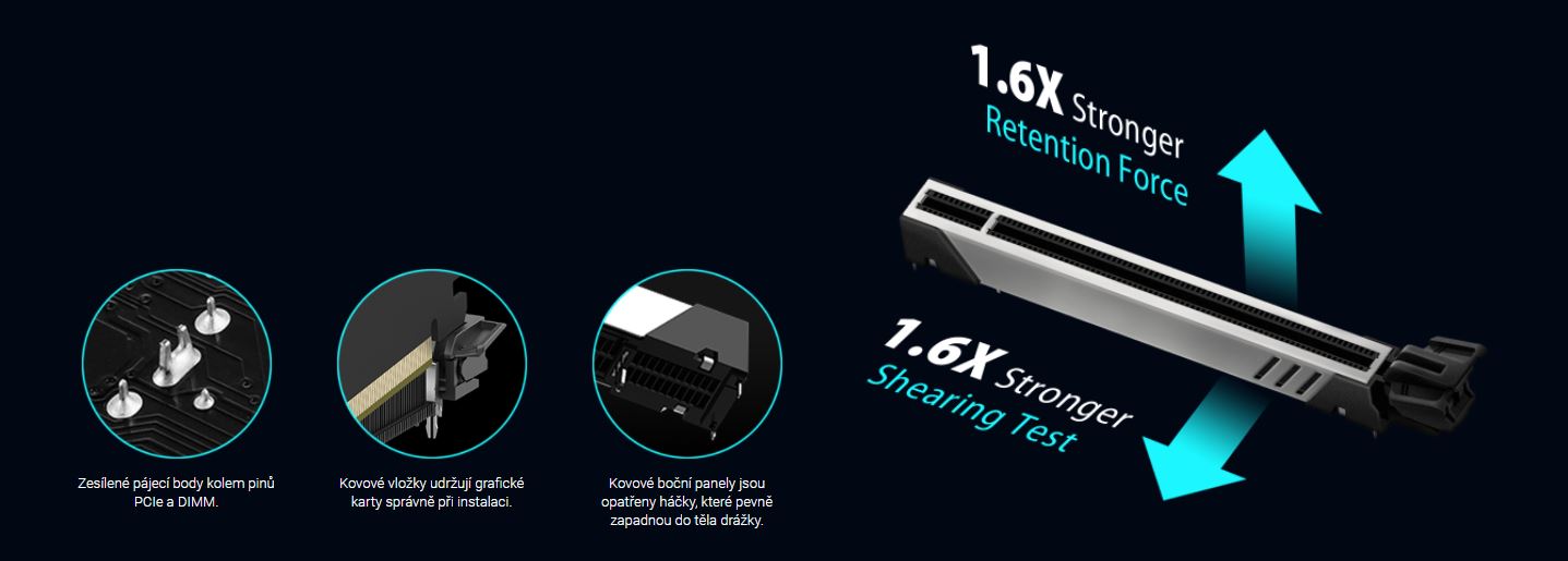SafeSlot Core+ je ASUS exkluzivní slot PCIe obohacený o jednodílnou výztuhu z nerezové oceli, která slot chrání před poškozením. Kovový kryt je pevně připevněn ke slotu pomocí háčků a celá sestava je pevně ukotvena k desce plošných spojů s vyztuženými pájecími body, což zajišťuje bezpečný základ pro grafické karty s vysokou hmotností.