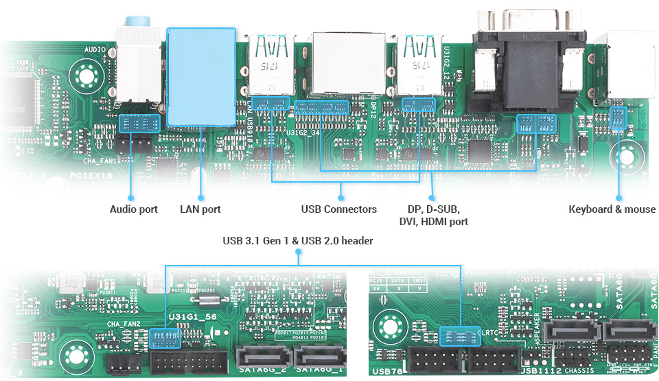 Všechny headery USB 3.1 Gen 1 a 2.0 jsou uspořádány v pravidelných boxech, čímž umožňují rychlou instalaci konektorů a zabraňují poškození pinů.