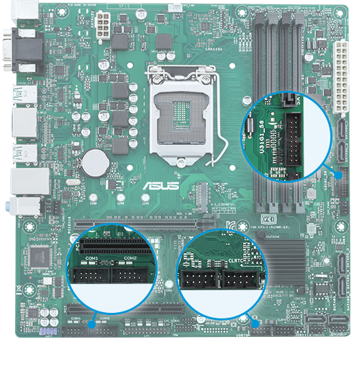 Pozice konektorů na komerčních základních deskách ASUS pro firmy zůstávají konzistentní v rámci celé generace produktů. Chrání tak vaše investice do zaškolení, výroby a do podpory hardwaru.