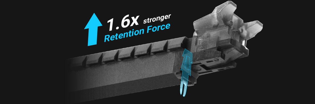 SafeSlot Core je exkluzivní PCIe® slot ASUS. Díky zesílené konstrukci, která je zakotvena na základní desce speciálním hákem, nabízí Safeslot Core 1,6x silnější pevnost a 1,3x větší odolnost proti ulomení než standardní rozšiřující sloty.