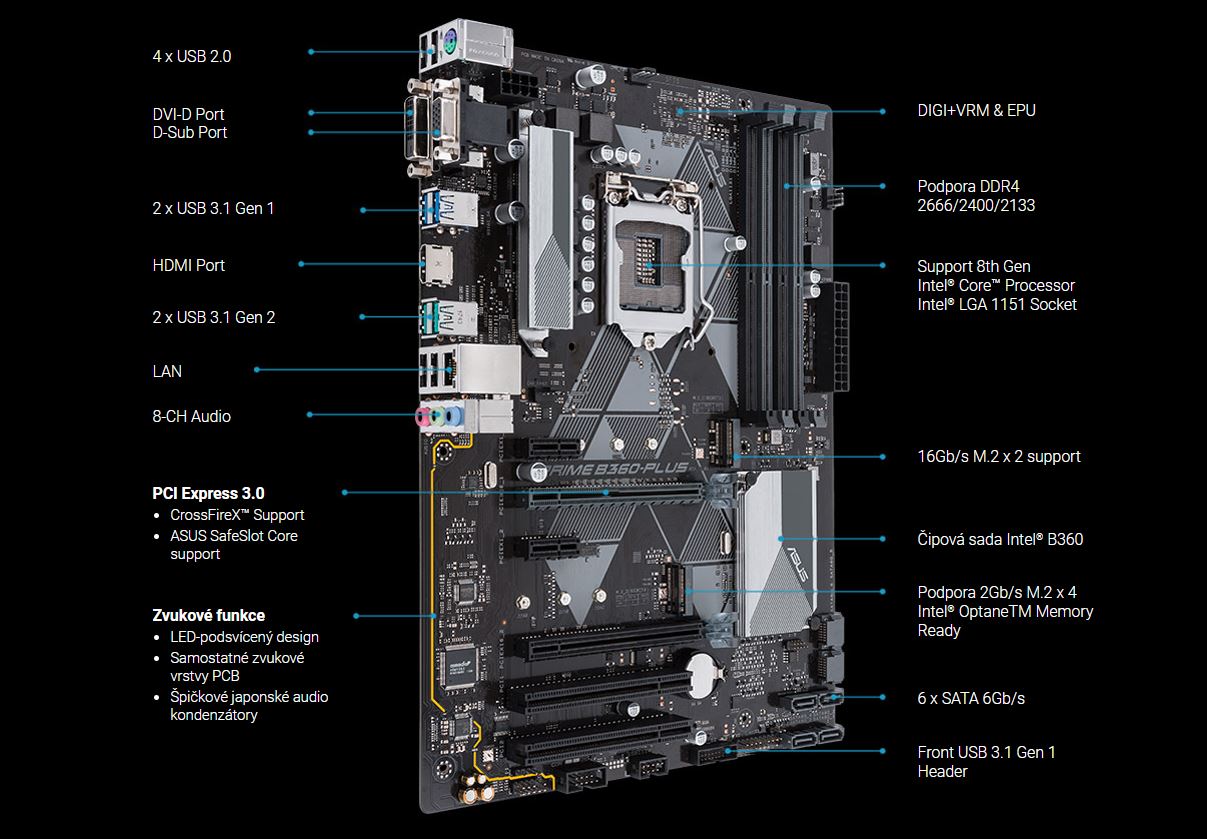 Základní desky řady ASUS Prime 300 poskytují solidní základ pro vaši první vlastní sestavu s flexibilitou pro růst s vašimi ambicemi. Nabízí vše, co přinášejí nejnovější procesory Intel® Core™ 8. generace s nezbytným designem a inženýrstvím společnosti ASUS. Získáváte tak špičkové technologie — včetně automatizovaného ladění systému, komplexního ovládání chlazení a dokonalého integrovaného zvuku. Pokud postavíte svou sestavu na základní desce řady ASUS Prime 300, postavíte inteligentní, jednoduché a cenově dostupné řešení.