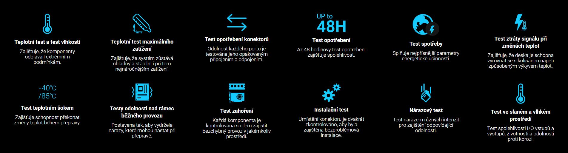 Základní desky ASUS se pyšní vynikající odolností. Každá deska je podrobena více než 8000 hodinám přísných testů. Testy zahořením, testy životního prostředí, testy kompatibility, softwarové testy a bezpečnostní testy potvrzují, že naše desky jsou mimořádně stabilní. Naše testy jsou ve svém odvětví jedinečné a přísnější než průmyslové standardy. Chceme si totiž být jistí, že každý náš produkt je zkonstruován tak, aby fungoval bezchybně v každém prostředí.