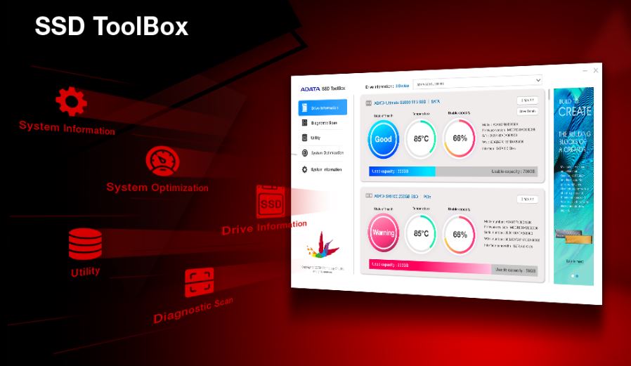SSD ToolBox automaticky zajišťuje, abyste měli k dispozici nejnovější firmware pro optimální výkon, a umožňuje sledovat stav jednotek a zbývající životnost prostřednictvím technologie SMART (Self-Monitoring, Analysis, and Reporting Technology). Rovněž umožňuje sledovat aktuální provozní teplotu, kapacitu a celkový využitý prostor.
