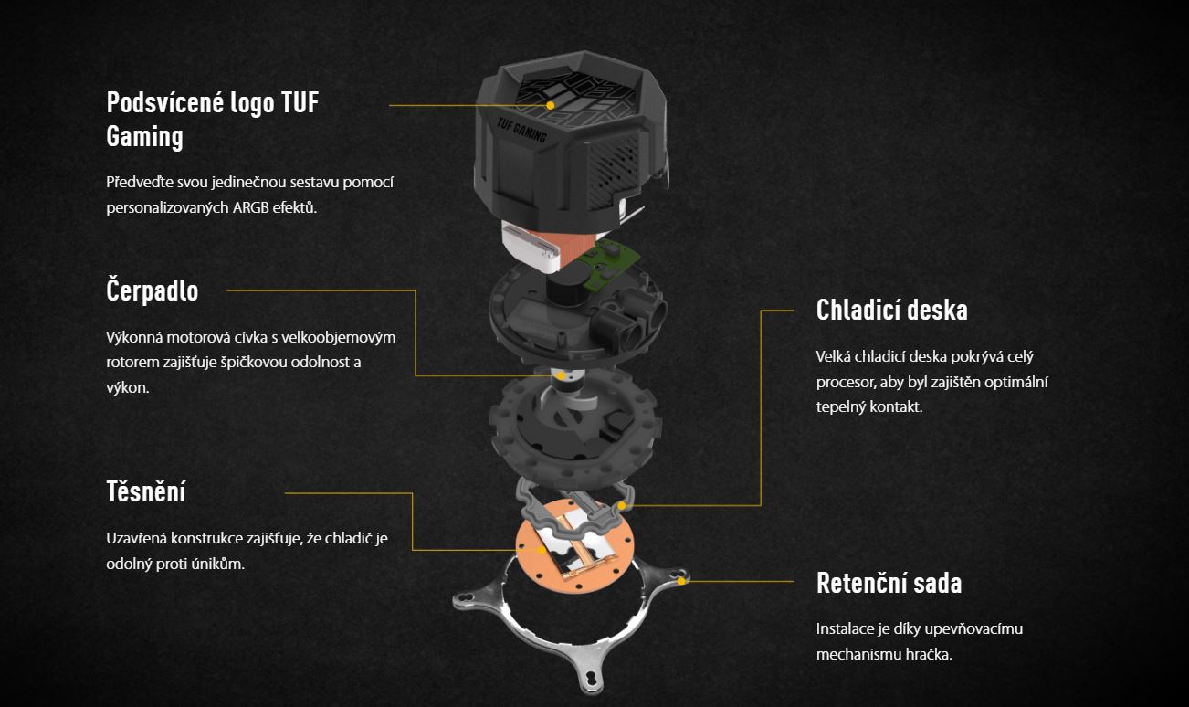 TUF Gaming LC ARGB je řada odolných vodních chladičů procesoru, které poskytují výkon a funkce potřebné k dosažení toho nejlepšího ve středně velkých herních sestavách. Každý chladič je stylově doplněn o prvky ARGB s podporou technologie Aura Sync, které osvětlují ventilátor a logo TUF Gaming na krytu čerpadla.