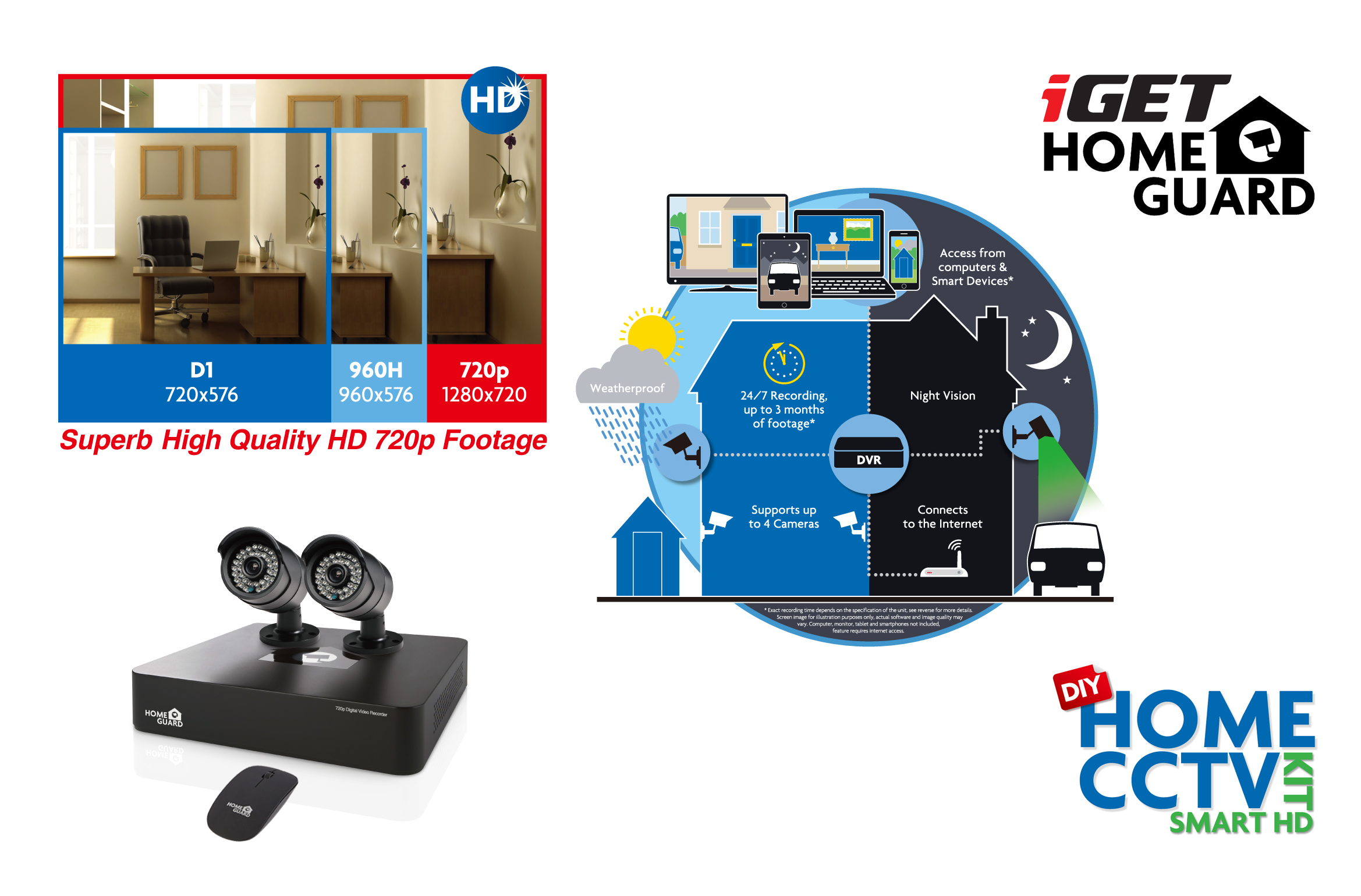 Kamery iGET HOMEGUARD HGPRO728, které jsou v setu obsaženy, disponují kvalitním snímačem CMOS 1/4" s rozlišením 1280 x 720 bodů (HD 720p), díky kterému se můžete těšit na jasný a ostrý obraz. Videozáznamy pořizují rychlostí 25 snímků za vteřinu s využitím kódování H.264. Kamery obsahují LED diody pro noční vidění s dosahem 30 m. Díky těmto parametrům je možné použití kamer ve všech prostorách i s nulovou nebo sníženou viditelností.
