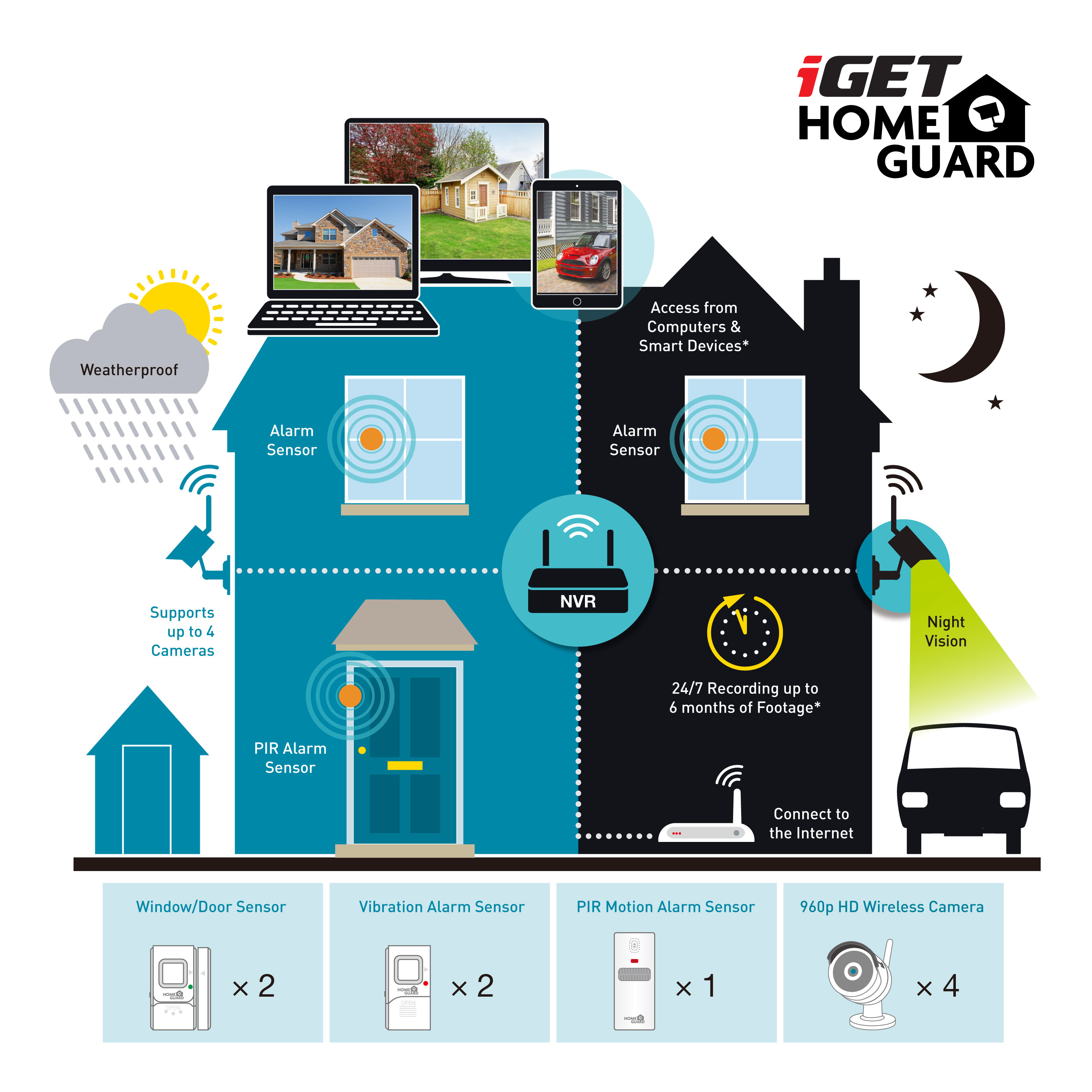 Kamery iGET HOMEGUARD IP WiFi 960p, které jsou v setu obsaženy, disponují kvalitním snímačem CMOS 1/3" s rozlišením 1280 x 960 bodů (HD 960p), díky kterému se můžete těšit na jasný a ostrý obraz. Videozáznamy pořizují rychlostí 18 snímků za vteřinu s využitím kódování H.264. Kamery obsahují LED diody pro noční vidění s dosahem 30 m. Díky těmto parametrům je možné použití kamer ve všech prostorách i s nulovou nebo sníženou viditelností.