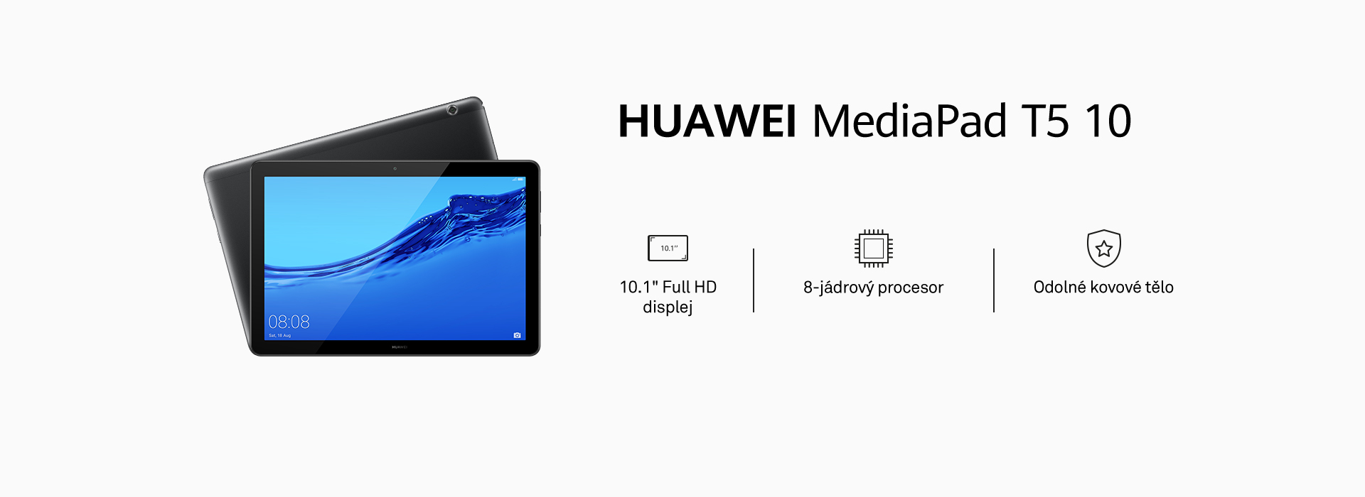 HUAWEI MediaPad T5 je oku lahodící tablet s prémiovým designem. Jeho symetrické kovové tělo je vyrobené s maximální péčí a je velmi tenké a lehké (okolo 460 g), aby se snadno nosilo a příjemně drželo.
