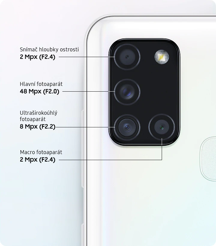 Galaxy A21s má lesklý holografický finiš, který vás okamžitě zaujme. Jemné křivky těla telefonu umožňují snadné a bezpečné držení při ovládání. Vyberte si z černého, bílého, modrého nebo červeného provedení, které se sladí s vaším jedinečným stylem.