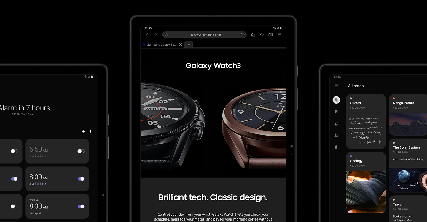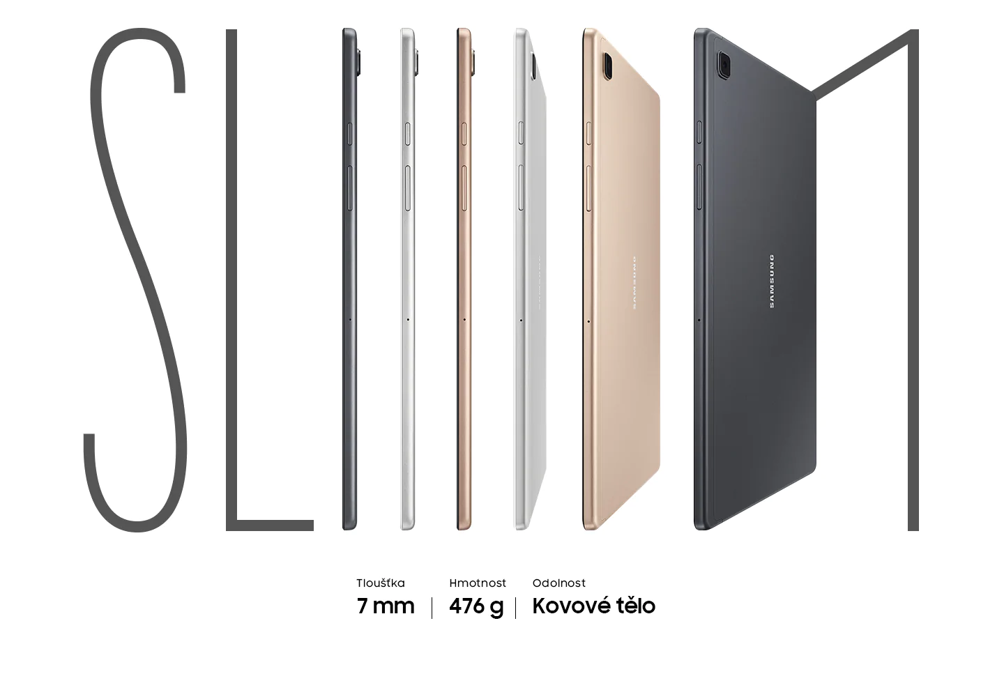 Galaxy Tab A7 je navržený tak, aby zaujal – nabízí skvělé, pohlcující zážitky, a navíc upoutá pozornost každého. Vyznačuje se krásnou symetrií, tloušťkou pouhých 7 mm a propracovaným kovovým designem ve třech barvách: tmavě šedé, stříbrné a zlaté. To vše v souměrném rámu, který lemuje celý obvod tabletu.