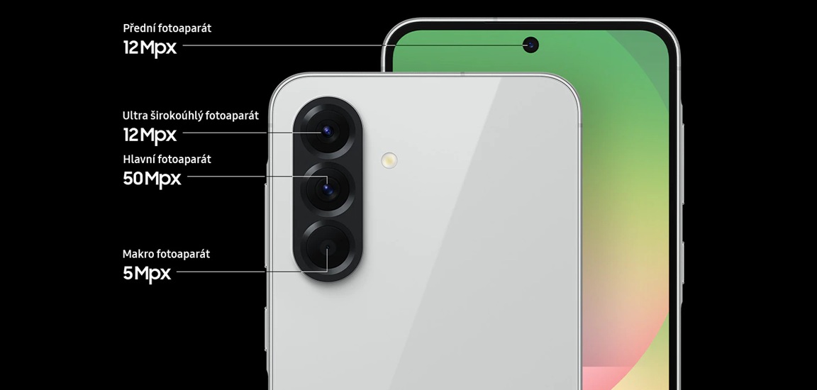 Představujeme ti Galaxy A56 5G. S tloušťkou 7,5 mm a hmotností pouhých 198 g budeš moci telefon komfortně držet po dlouhé hodiny. Modul s vylepšenými fotoaparáty parádně sedí k novému lineárnímu designu, přičemž zařízení přichází v hned čtyřech svěžích barevných provedeních – Awesome Graphite, Awesome Lightgray, Awesome Olive a Awesome Pink.
