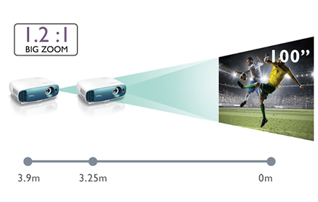 1,2x zoom rozšiřuje dostupný prostor flexibilní řadou projekčních vzdáleností pro zábavu na velké projekční ploše bez problémů se složitou instalací.