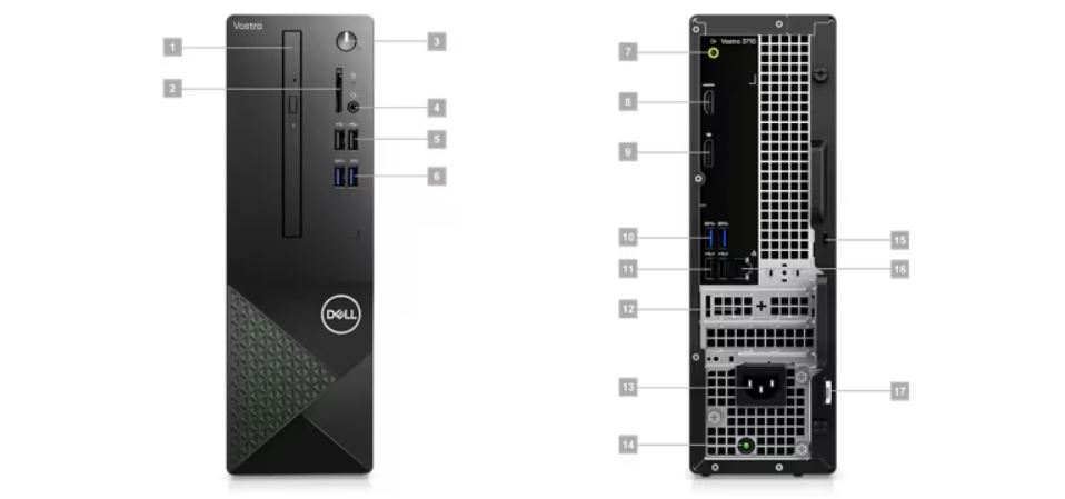 1. Volitelná optická jednotka | 2. Volitelná čtečka paměťových karet | 3. Vypínač | 4. Kombinovaný konektor typu jack | 5. 2x port USB 2.0 Type-A | 6. 2x port USB 3.2 1. generace Type-A | 7. Linkový výstup | 8. Port HDMI 1.4b | 9. Display Port | 10. 2x port USB 3.2 1. generace Type-A | 11. 2x port USB 2.0 Type-A | 12. Rozšiřujících sloty | 13. Napájecí zdroj | 14. Tlačítko diagnostiky zdroje napájení | 15. Slot pro zámek Kensington | 16. Port RJ-45 | 17. Visací zámek
