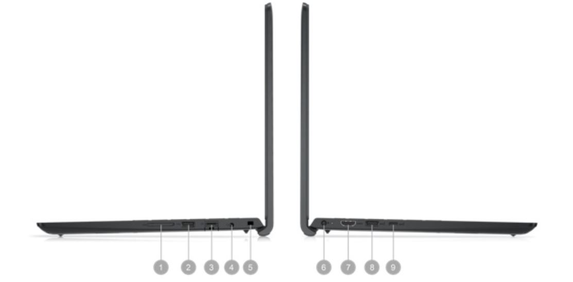 1. Čtečka paměťových karet SD | 2. Port USB 2.0 | 3. Port RJ-45 | 4. Konektor pro náhlavní soupravu | 5. Slot pro zámek Wedge | 6. Napájecí konektor | 7. Port HDMI 1.4 | 8. Port USB 3.2 1. generace | 9. Port USB 3.2 1. generace nebo USB 3.2 1. generace Type-C