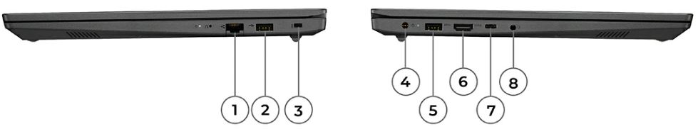 1. Ethernet (RJ45) | 2. USB 2.0 | 3. Kensington Nano Security Slot™ | 4. Napájení | 5. USB 3.2 Gen 1 | 6. HDMI 2.0 | 7. USB-C 3.2 | 8. Vstup sluchátek/mikrofonu