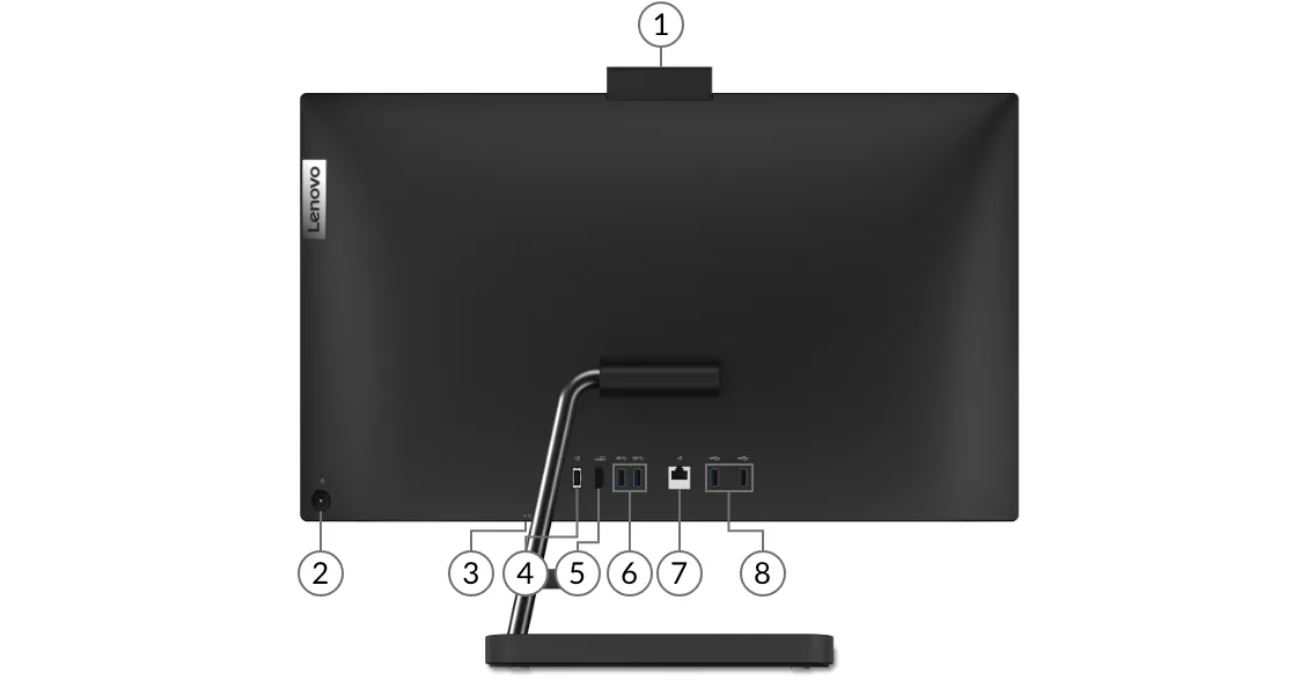 1. Webkamera | 2. Tlačítko pro zapnutí | 3. Kombinovaný port pro sluchátka a mikrofon | 4. Napájení | 5. HDMI | 6. 2 x USB-A 3.2 Gen 2 | 7. RJ45 | 8. 2 x USB-A 2.0