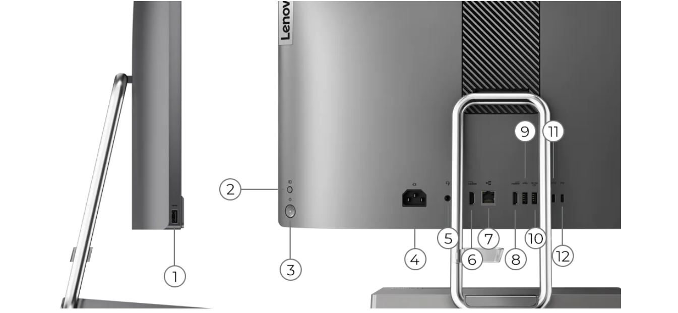 1. USB-A 3.1 Gen 1 | 2. HDMI vstup/výstup | 3. Tlačítko pro zapnutí | 4. Napájení | 5. Kombinovaný port pro sluchátka a mikrofon | 6. HDMI vstup | 7. Ethernet (RJ45) | 8. HDMI výstup | 9. USB-A 2.0 | 10. USB-A 3.2 Gen 1 | 11. USB-C 3.2 Gen 1 | 12. USB-C (PD 45W, DP-In)