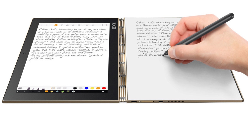 Představujeme Yoga Book, revoluční 10,1 "tablet 2 v 1 stvořený na produktivní práci. Toto přenosné zařízení vám umožní zapisovat poznámky a kreslit se stylusem s reálným inkoustem. Kromě toho můžete používat i klávesnici Halo, která se zobrazuje pouze tehdy, když ji potřebujete . Pracujte na cestách pohodlnější než na jakémkoli jiném tabletě.